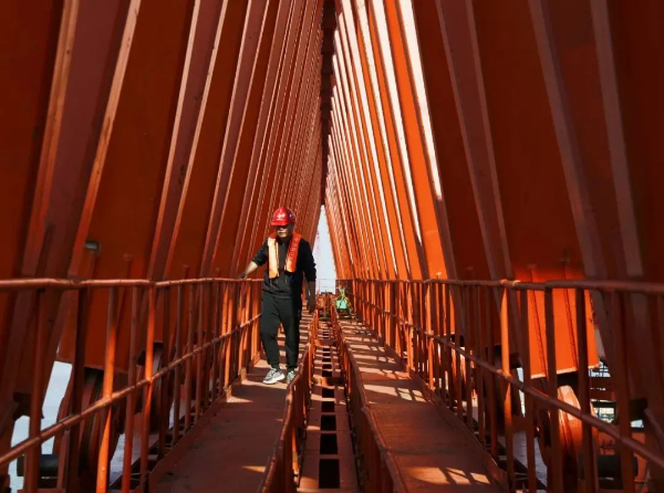 现场技术人员正在检查架桥机 黄茅海项目作为《粤港澳大湾区发展规划纲要》发布后首个开工建设的跨海通道工程,如今在广阔的黄茅海海面上已有蛟龙出海之势。两座主体工程黄茅海大桥和高栏港大桥桥墩“节节高”,其中黄茅海大桥主墩中、西塔已完成第7节塔柱混凝土浇筑,东塔正进行第4节塔柱劲性骨架安装;高栏港大桥主墩西塔正进行第3节塔柱钢筋绑扎,防裂网片安装,东塔正在进行第3节塔柱模板搭设。