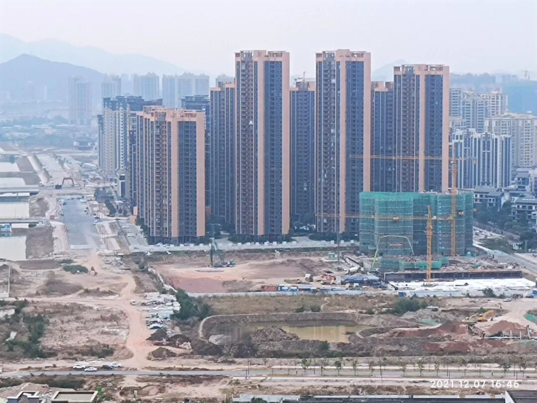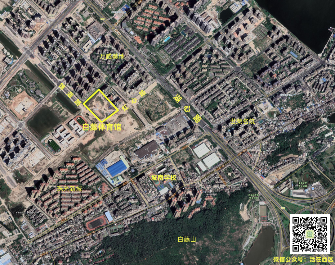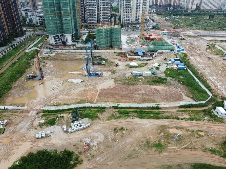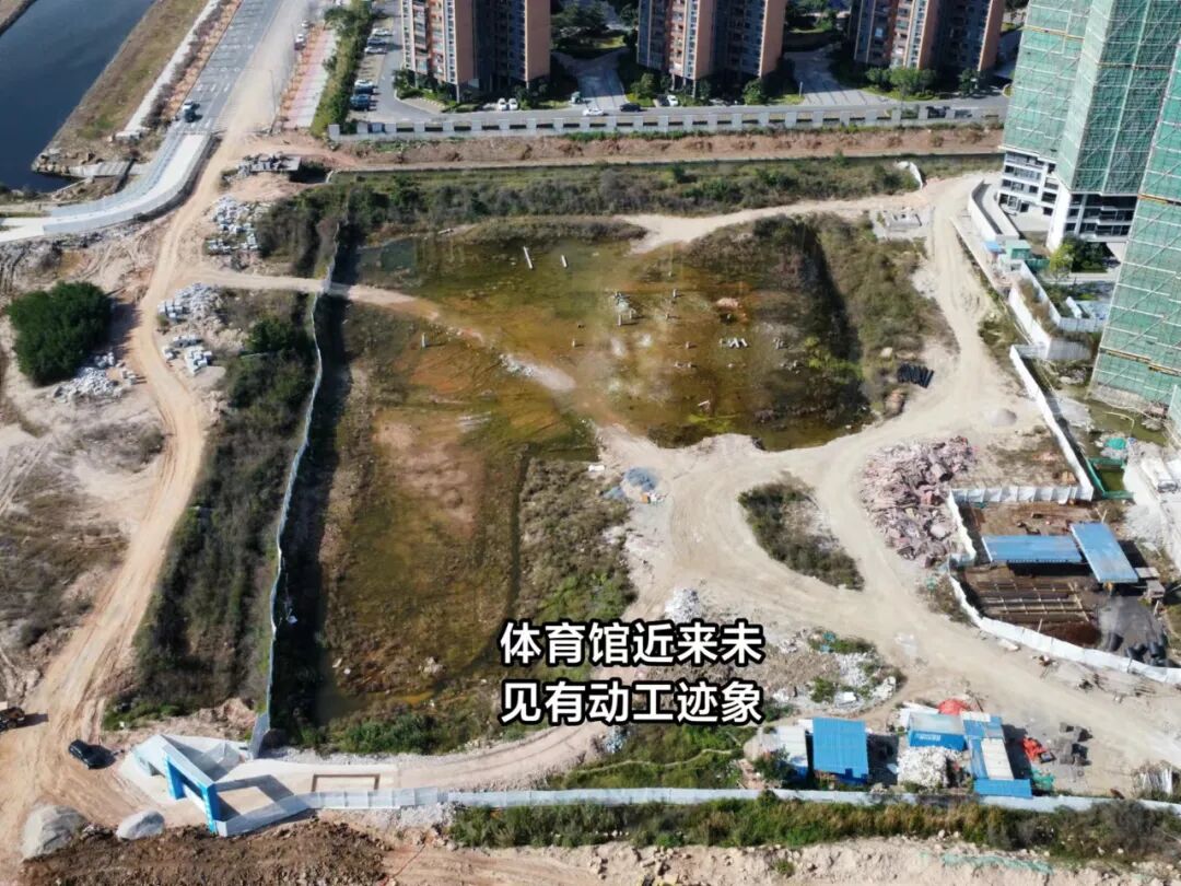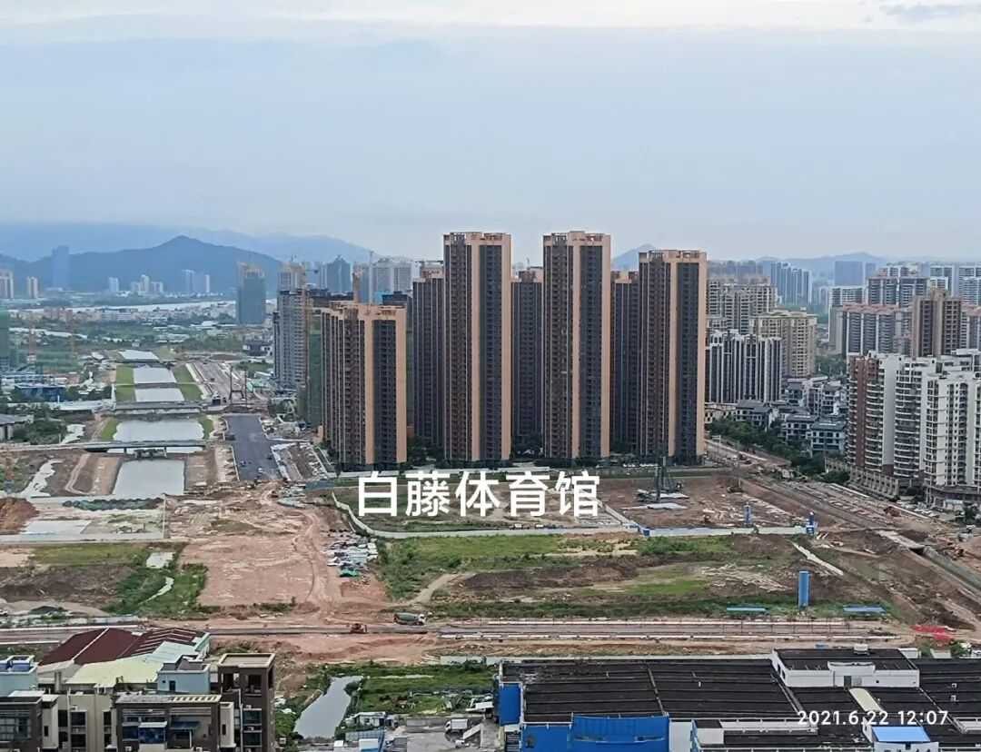 2021年12月,再隔半年,白藤体育中心地块有桩机进场开工。此时,旁边住宅已经盖起了两栋大楼。认真对比一下,2021年和2023年的实景相片,看看有什么变化。